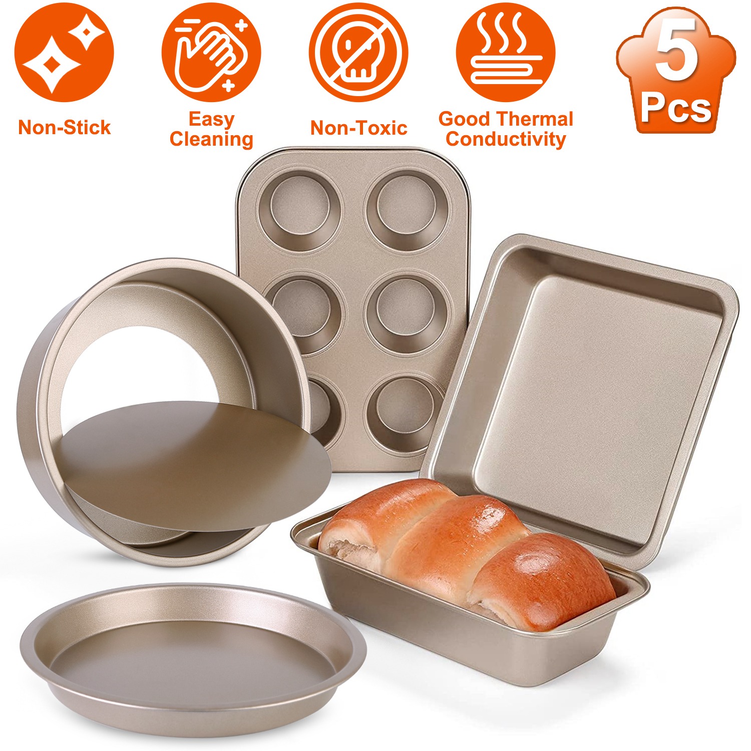 5Pcs Nonstick Bakeware Set Baking Tray Ovenware Sheet Kit w/ 6-Cup Muffin Pan Square Pan Loaf Pan Pizza Pan Live Bottom Round Cake Pan